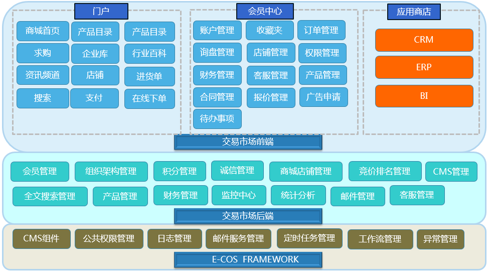 易思博B2B电子市场作为第三方交易平台(public Market)一种解决方案,集成了电子市场、电子商店、电子社区,为平台上的买家和卖家提供交易服务。支持电子目录、谈判法等多种交易模式。以易思博E-COS为基础平台,利用业界最先进的SOA架构,最大限度支持业务的扩展性、灵活性和自适应能力。